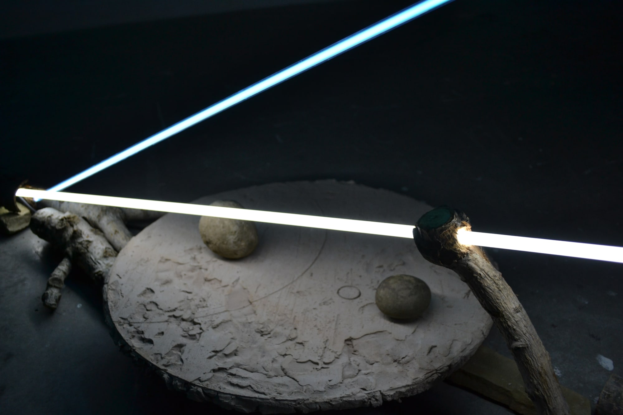 found wood, unfired ceramic, argon-mercury tubes, stones, transformers