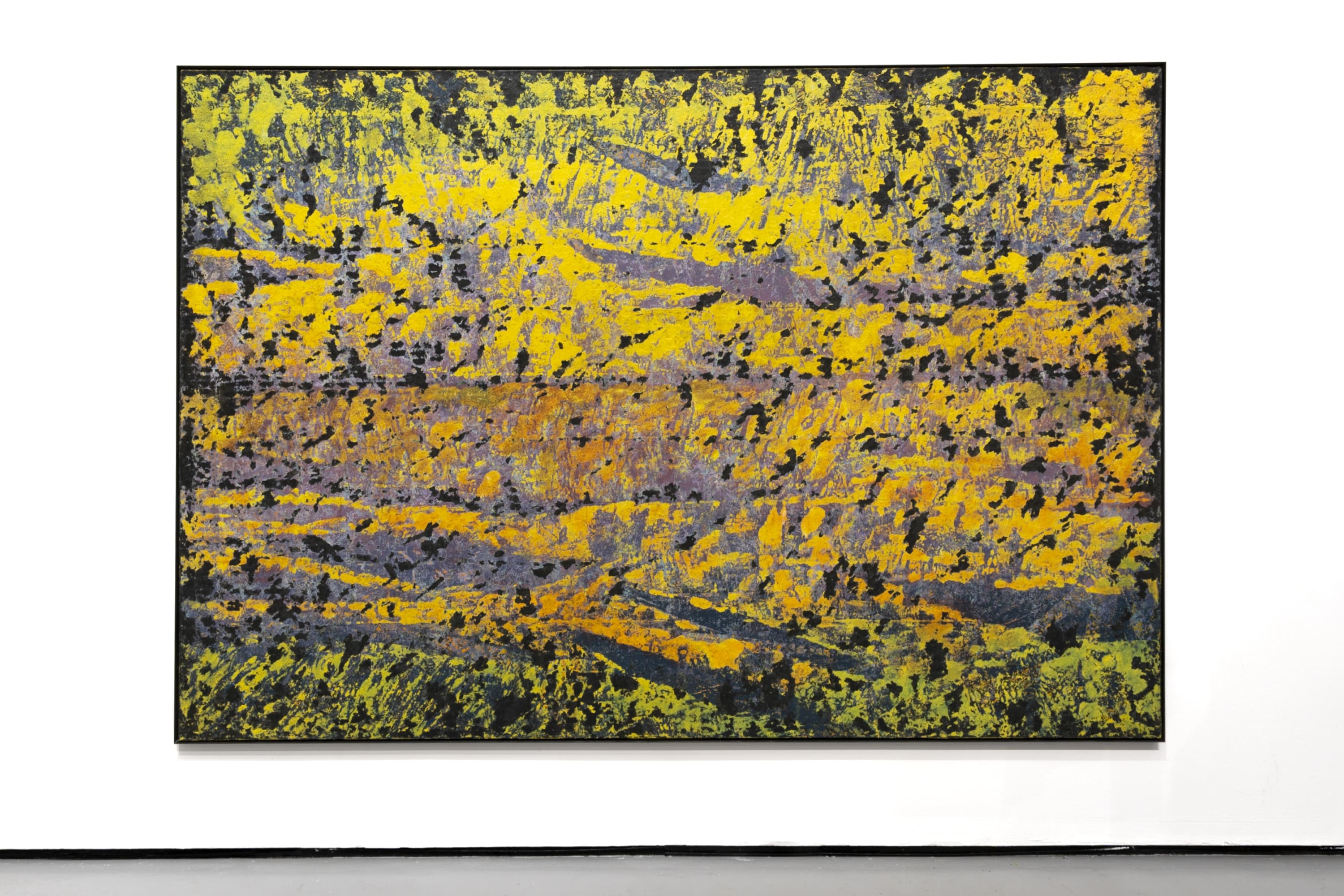Oil, calcium carbonate, graphite, polymer, silver nitrate, and ferrous oxalate on canvas with steel frame, 217”x 97”